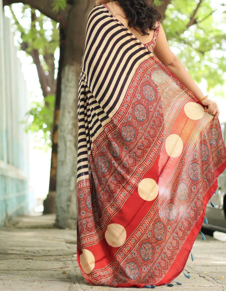 Cream Black Ajrakh Silk Saree - Elegant Traditional Wear