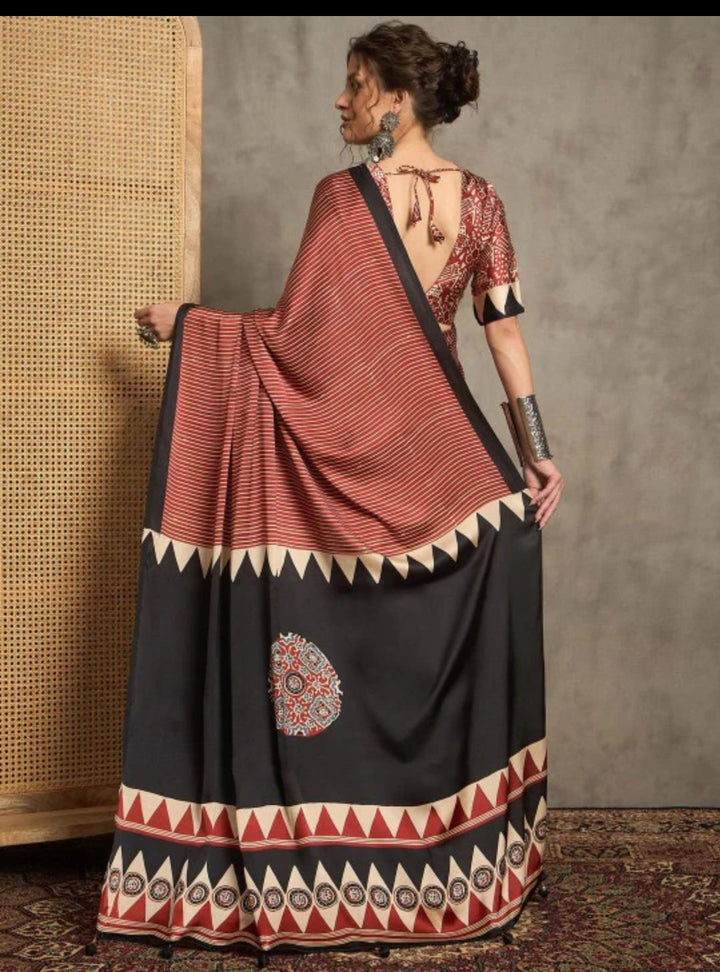 Ajrakh Print Premium Silk fabric Saree With very soft in texture.. Light weight Silk Fabric with a rich glaze .