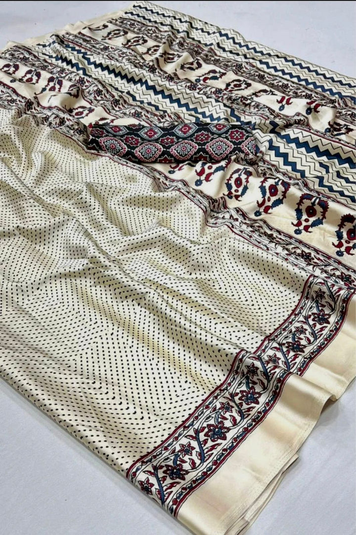 Exclusive Cream Ajrakh Printed Crape Silk Saree