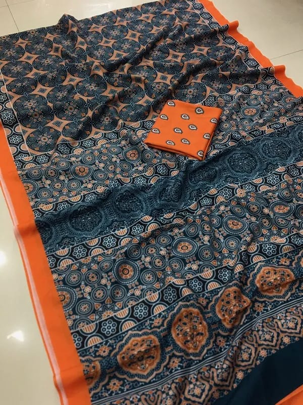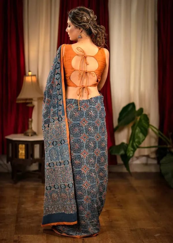 Ajrakh Digital Print Border with Ajrakh Rich Pallu With Contrast Blouse
